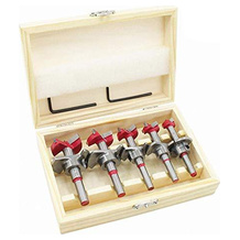 6x Fostnerbohrer, 6x Tiefenstopps, Topfscharnierschablone, Anleitung, Holzbox